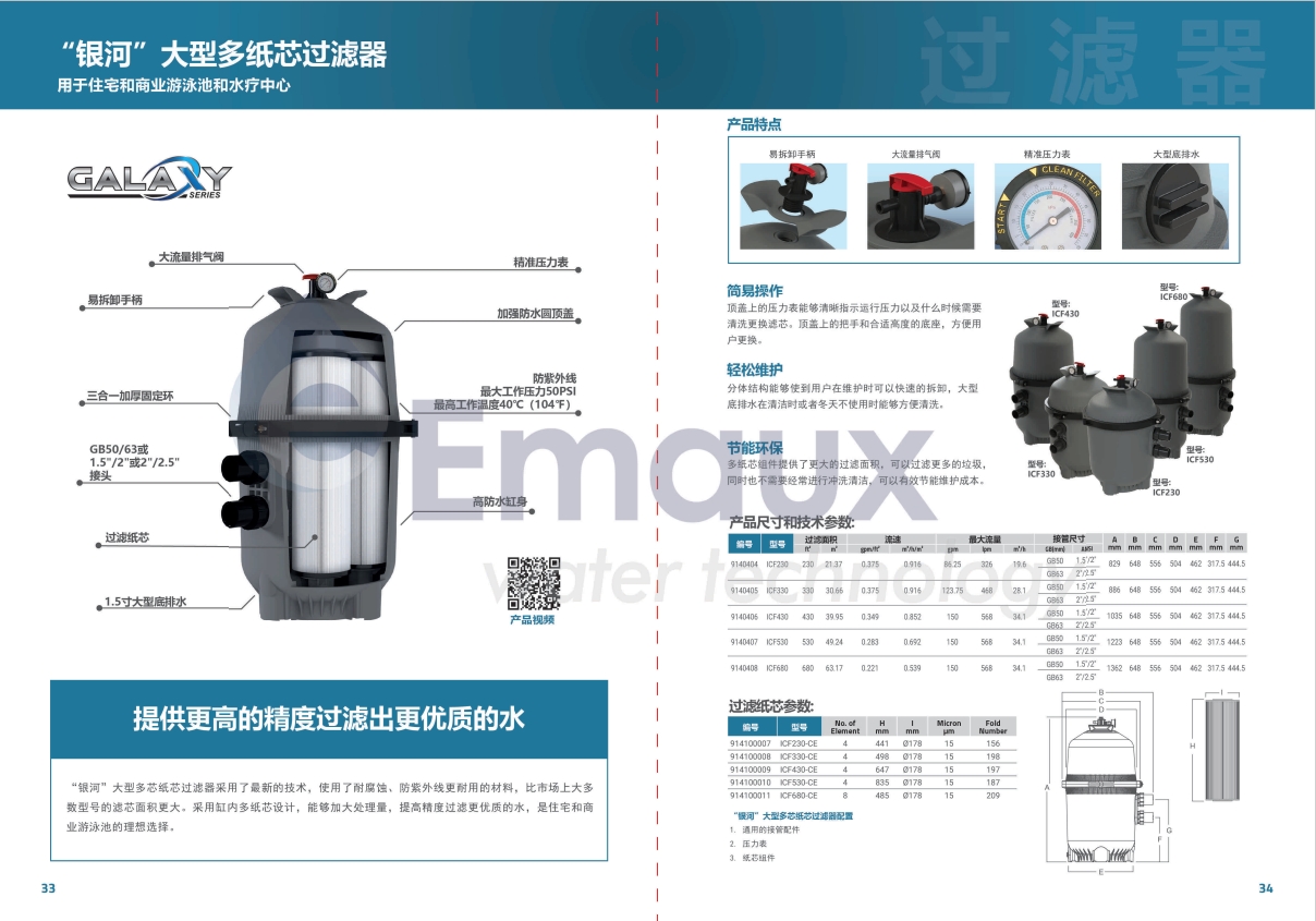 “銀河”大型多芯紙芯過濾器采用了最新的技術(shù),使用了耐腐蝕、防紫外線更耐用的材料,比市場上大多數(shù)型號(hào)的濾芯面積更大。采用缸內(nèi)多紙芯設(shè)計(jì),能夠加大處理量,提高精度過濾更優(yōu)質(zhì)的水,是住宅和商業(yè)游泳池的理想選擇。