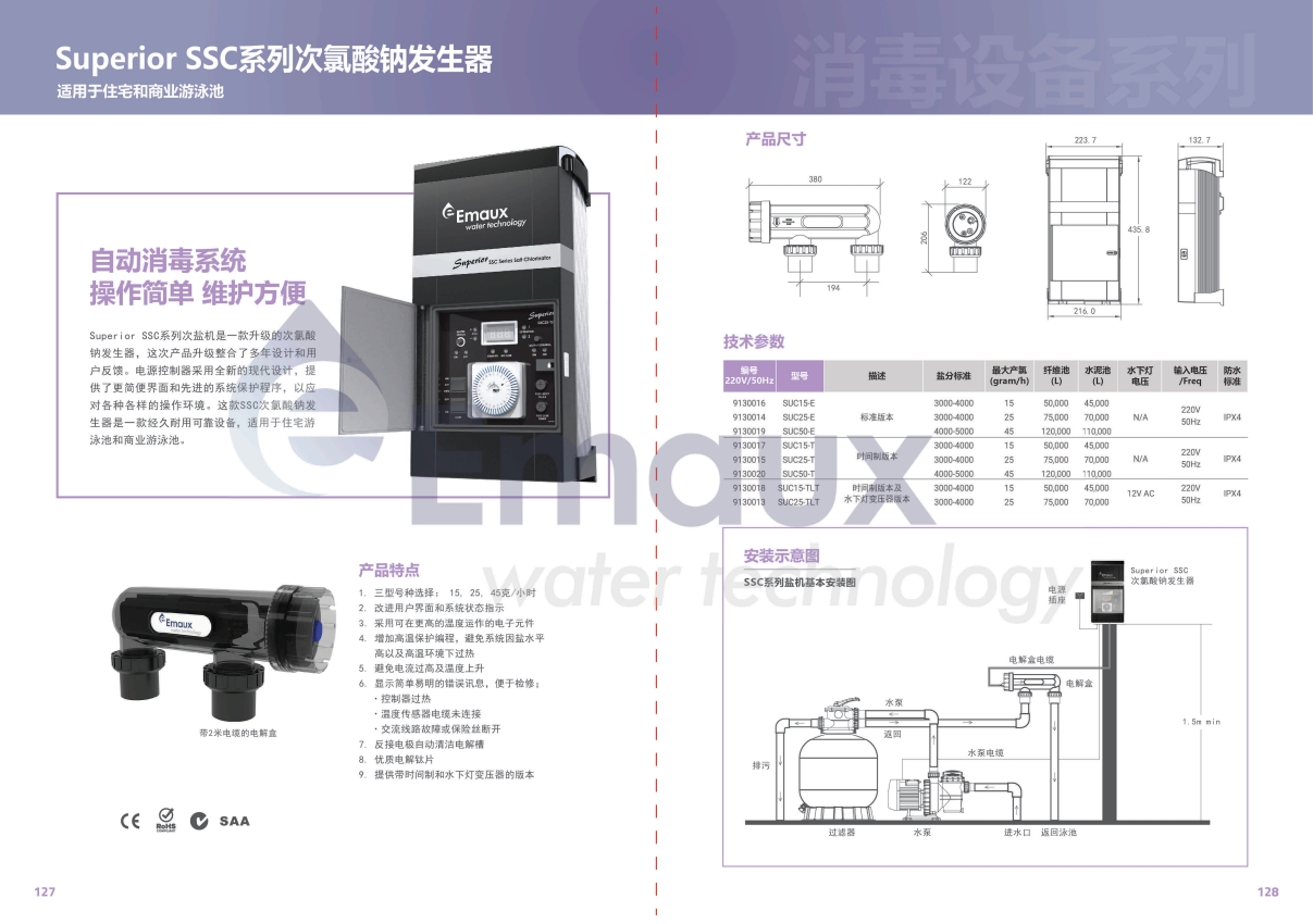 Superior SSC系列次鹽機(jī)是一款升級的次氯酸鈉發(fā)生器這次產(chǎn)品升級整合了多年設(shè)計(jì)和用戶反饋。電源控制器采用全新的現(xiàn)代設(shè)計(jì),提供了更簡便界面和先進(jìn)的系統(tǒng)保護(hù)程序,以應(yīng)對各種各樣的操作環(huán)境。這款SSC次氯酸鈉發(fā)生器是一款經(jīng)久耐用可靠設(shè)備,適用于住宅游泳池和商業(yè)游泳池。