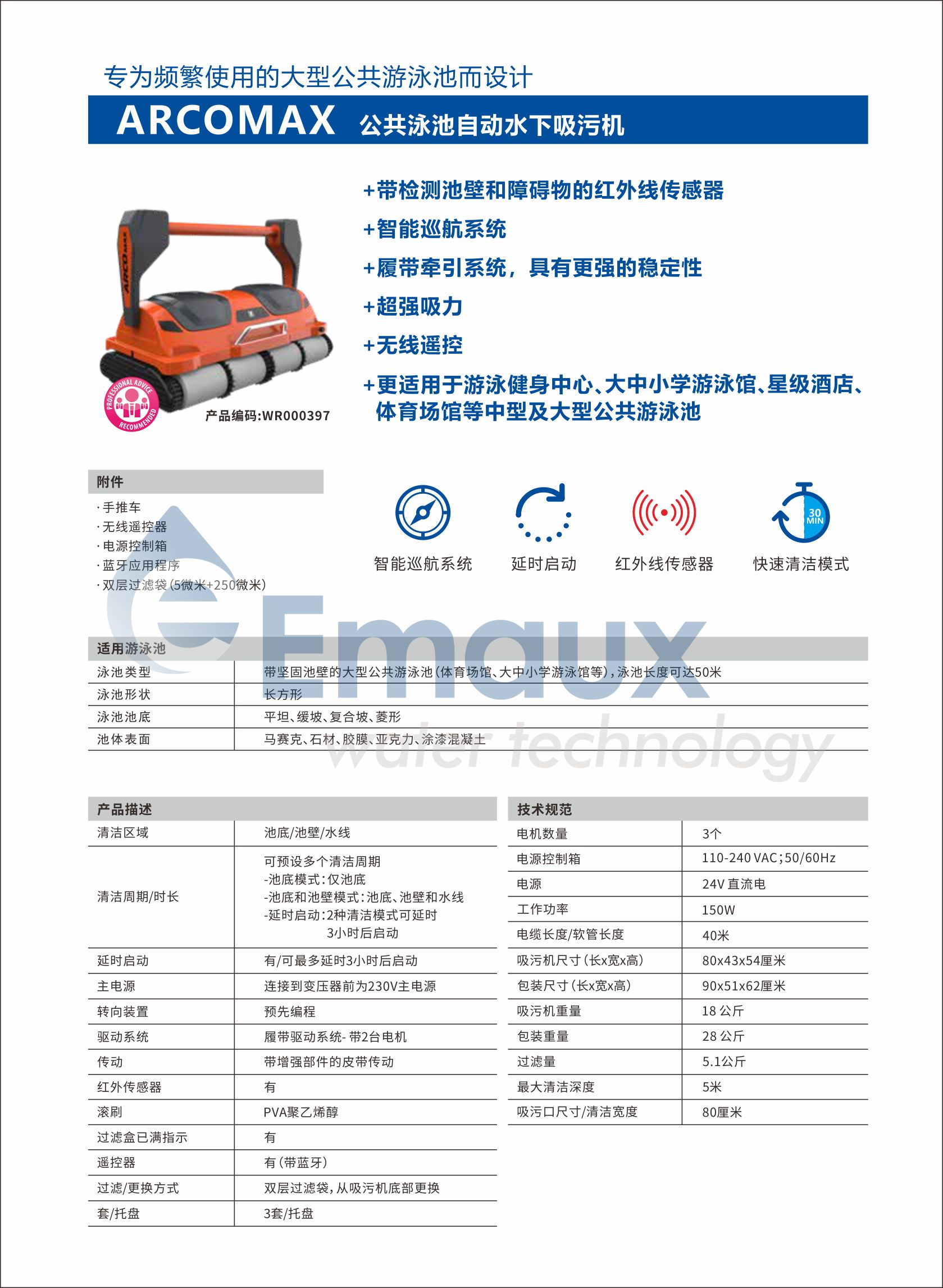★氣旋抽吸技術(shù)+超強(qiáng)吸污能力 ★雙層過(guò)濾袋 ★滾軸牽引系統(tǒng),更適合頻繁使用 ★帶檢測(cè)池壁和障礙物的紅外線傳感器 ★無(wú)線遙控,能手動(dòng)能定點(diǎn)操作清潔 ★智能巡航系統(tǒng) ★配有手推車(chē),使用更方便 ★更適用于游泳健身中心,大中小學(xué)游泳館,星級(jí)酒店,體育館等中型及大型公共游泳池