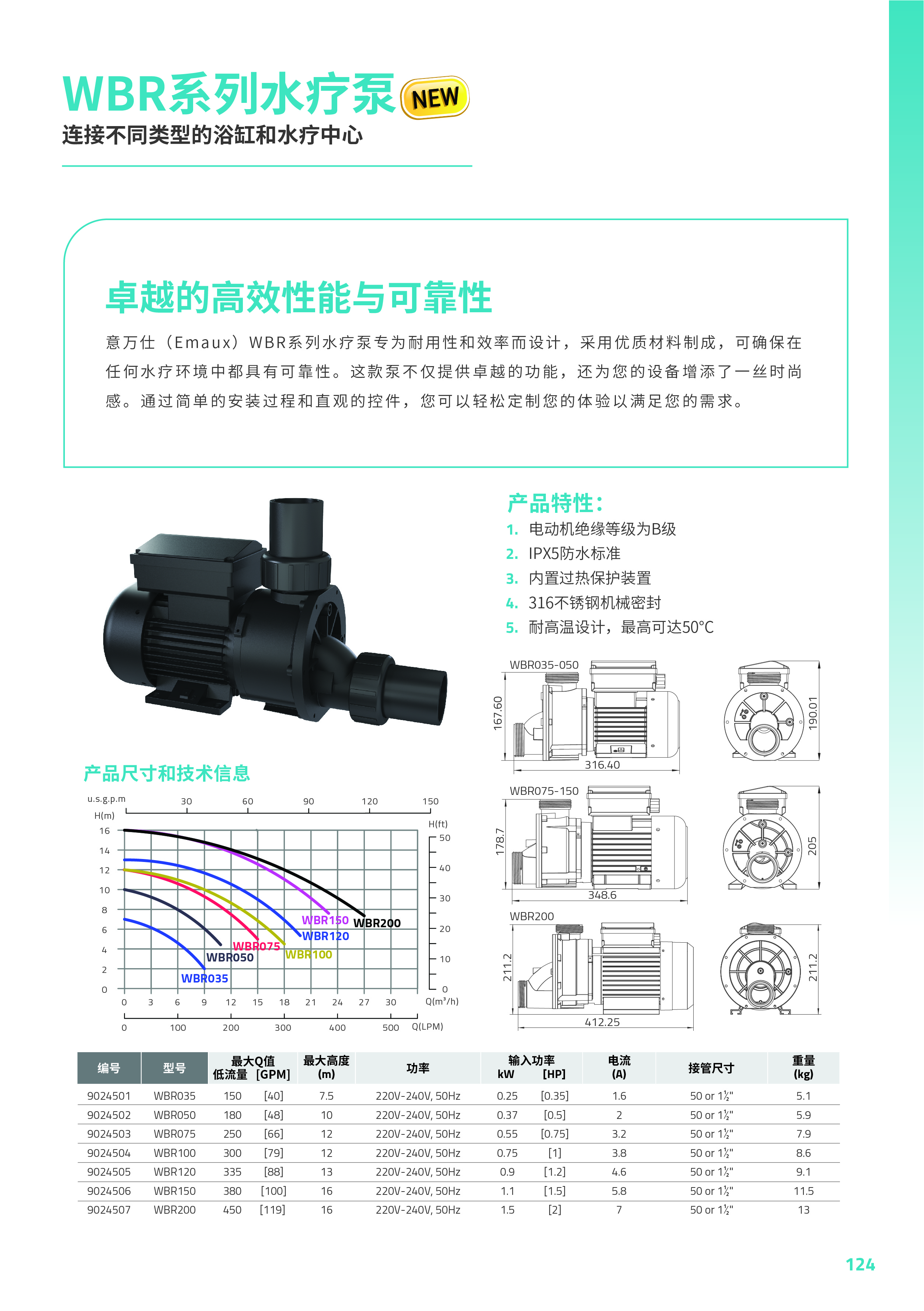 意萬仕(Emaux)WBR系列水療泵專為耐用性和效率?設(shè)計(jì),采用優(yōu)質(zhì)材料制成,可確保在 任何水療環(huán)境中都具有可靠性。這款泵不僅提供卓越的功能,還為您的設(shè)備增添了一絲時尚 感。通過簡單的安裝過程和直觀的控件,您可以輕松定制您的體驗(yàn)以滿?您的需求。