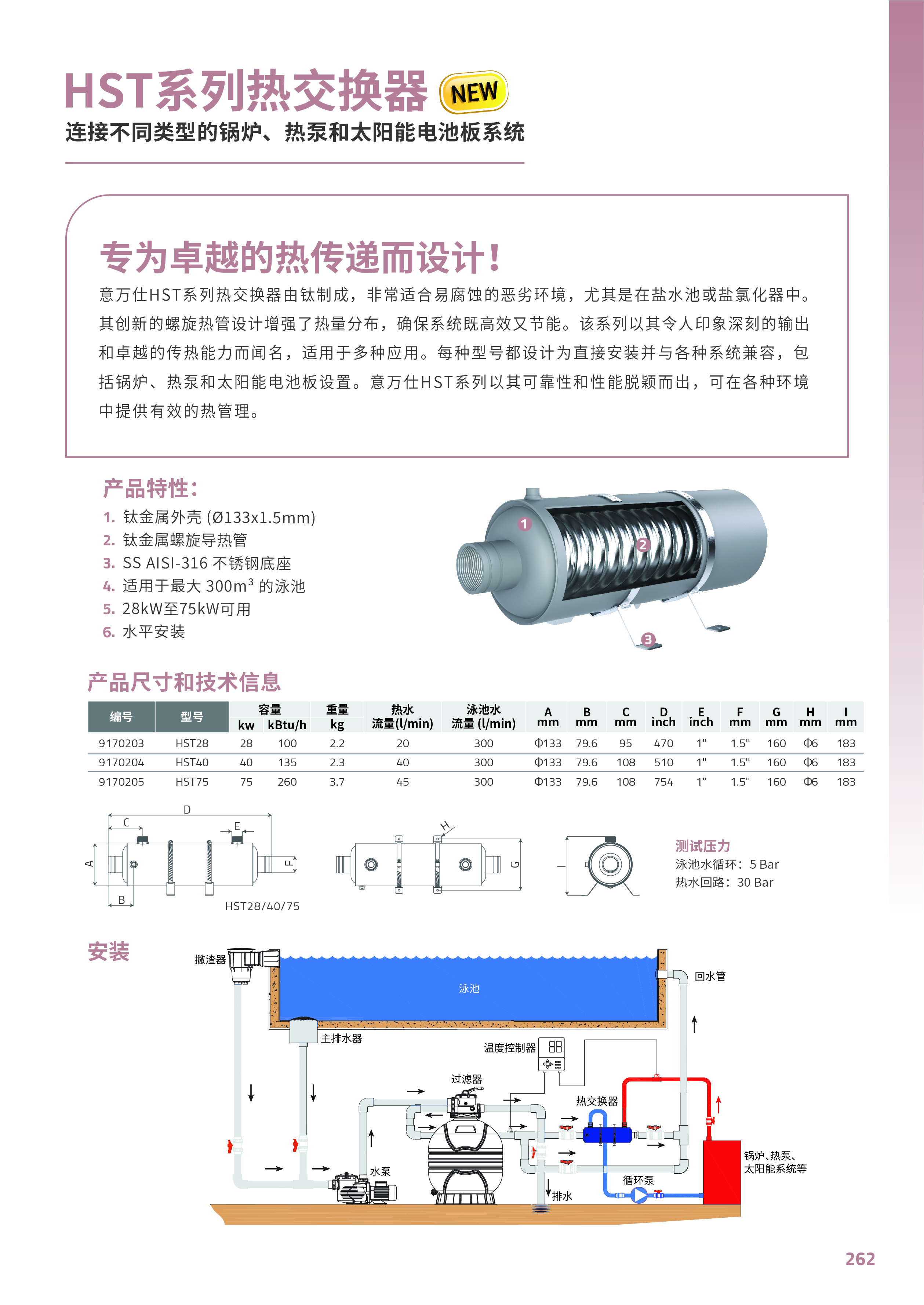 意萬仕HST系列熱交換器由鈦制成,?常適合易腐蝕的惡劣環(huán)境,尤其是在鹽水池或鹽氯化器中。 其創(chuàng)新的螺旋熱管設計增強了熱量分布,確保系統(tǒng)既?效?節(jié)能。該系列以其令?印象深刻的輸出 和卓越的傳熱能力而聞名,適用于多種應用。每種型號都設計為直接安裝并與各種系統(tǒng)兼容,包 括鍋爐、熱泵和太陽能電池板設置。意萬仕HST系列以其可靠性和性能脫穎而出,可在各種環(huán)境 中提供有效的熱管理。