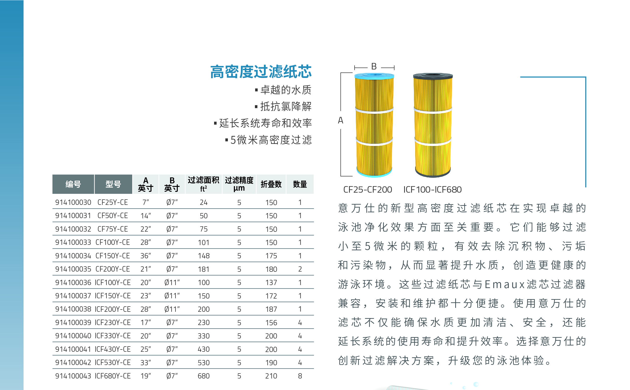 意萬仕的新型高密度過濾紙芯在實現(xiàn)卓越的 泳池凈化效果方面至關(guān)重要。它們能夠過濾 小至5微米的顆粒,有效去除沉積物、污垢 和污染物,從而顯著提升水質(zhì),創(chuàng)造更健康的 游泳環(huán)境。這些過濾紙芯與Emaux濾芯過濾器 兼容,安裝和維護都十分便捷。使用意萬仕的 濾芯不僅能確保水質(zhì)更加清潔、安全,還能 延長系統(tǒng)的使用壽命和提升效率。選擇意萬仕的 創(chuàng)新過濾解決方案,升級您的泳池體驗。