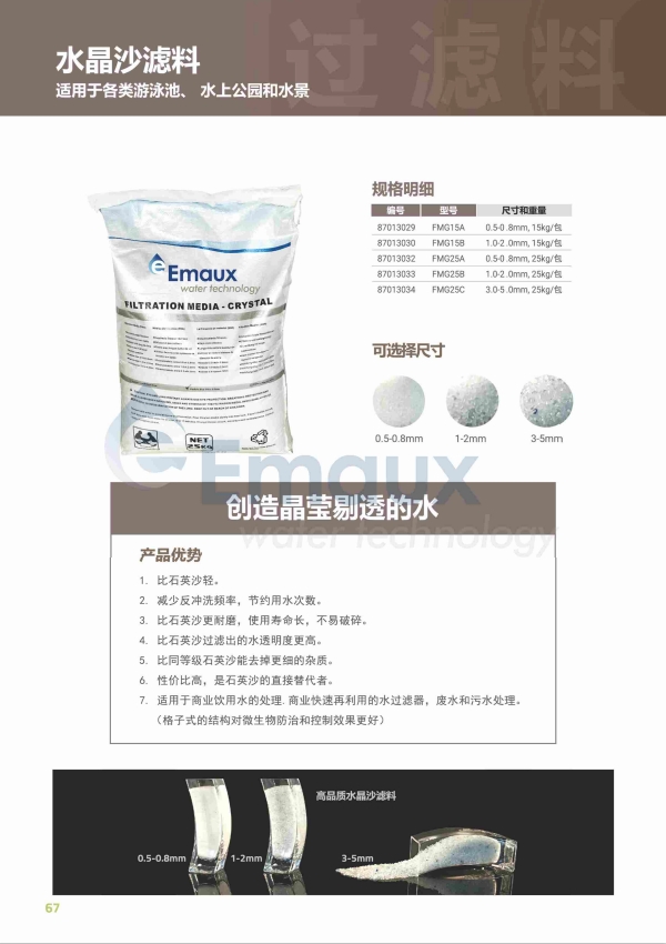 由于其高的過(guò)濾質(zhì)量,水晶沙已在很大程度上取代了傳統(tǒng)的石英沙。它通過(guò)去除更精細(xì)的雜質(zhì)來(lái)提高水的透明度,并通過(guò)減少電力反沖洗來(lái)節(jié)約用水。