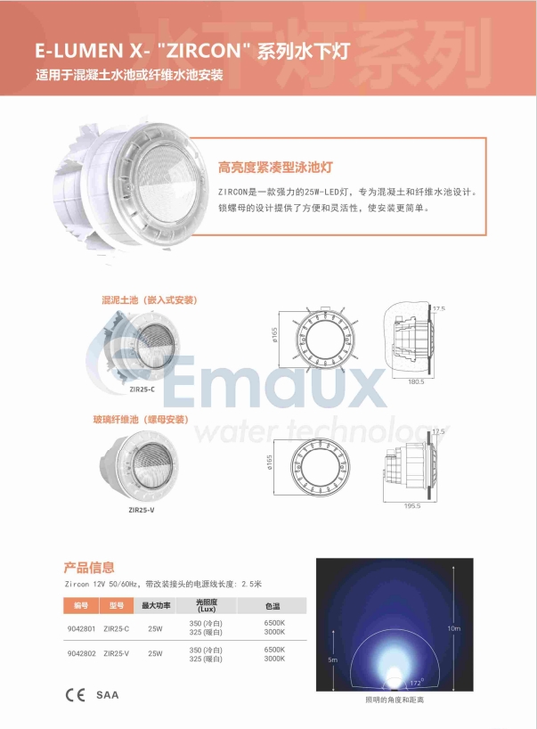 ZIRCON是一款強力的25W-LED燈,專為混凝土和纖維水池設計。 鎖螺母的設計提供了方便和靈活性,使安裝更簡單。