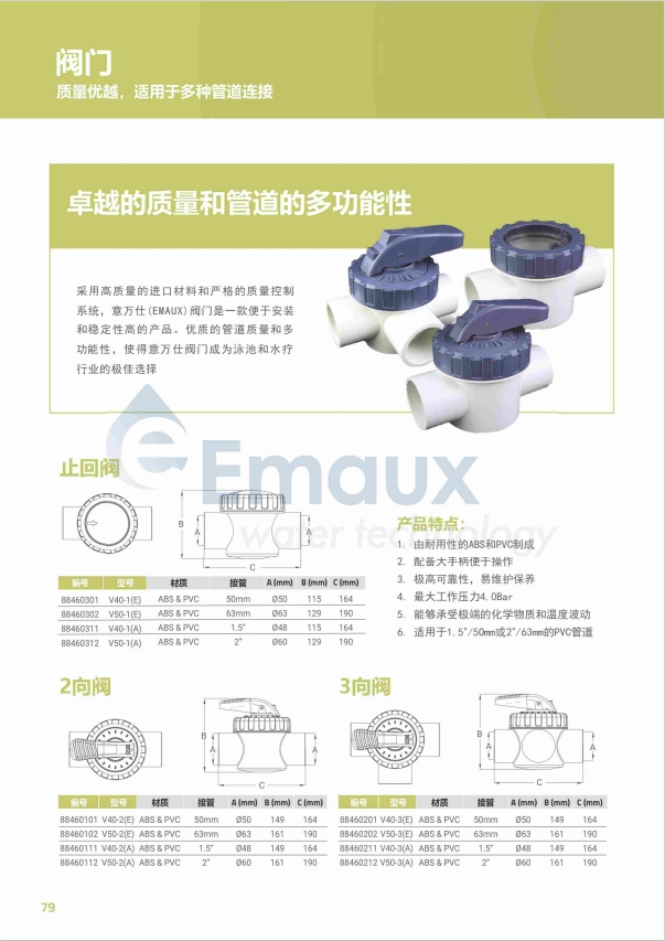 采用高質量的進口材料和嚴格的質量控制系統(tǒng),意萬仕(EMAUX)閥門是一款便于安裝和穩(wěn)定性高的產品。優(yōu)質的管道質量和多功能性,使得意萬仕閥門成為泳池和水療行業(yè)的極佳選擇