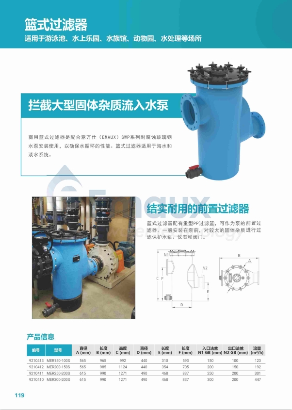 商用籃式過濾器是配合意萬仕(EMAUX)SWP系列耐腐蝕玻璃鋼水泵安裝使用,以確保水循環(huán)的性能。籃式過濾器適用于海水和淡水系統(tǒng)。