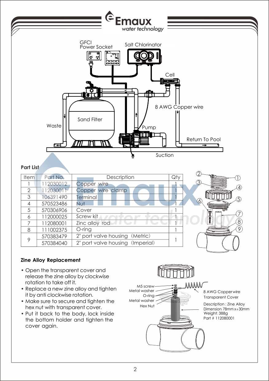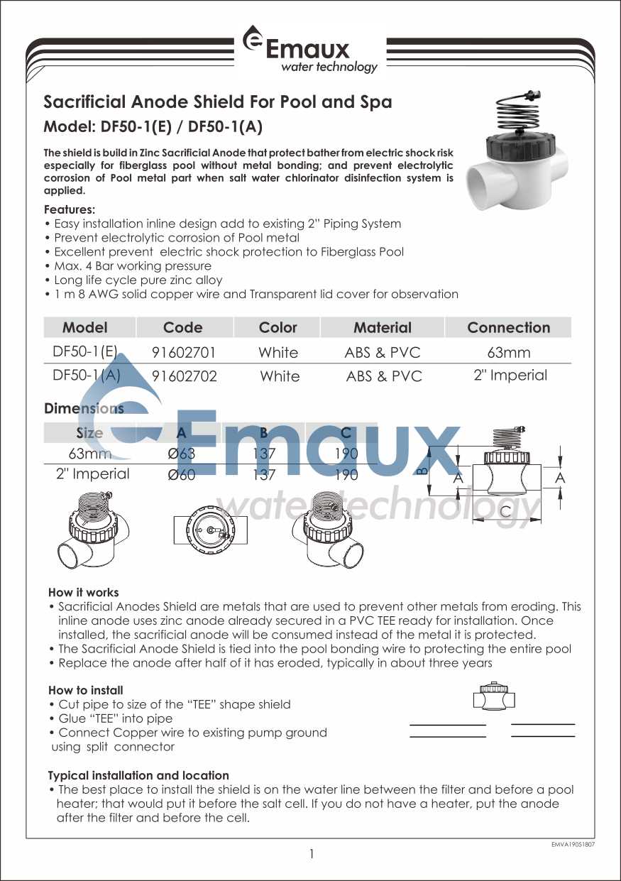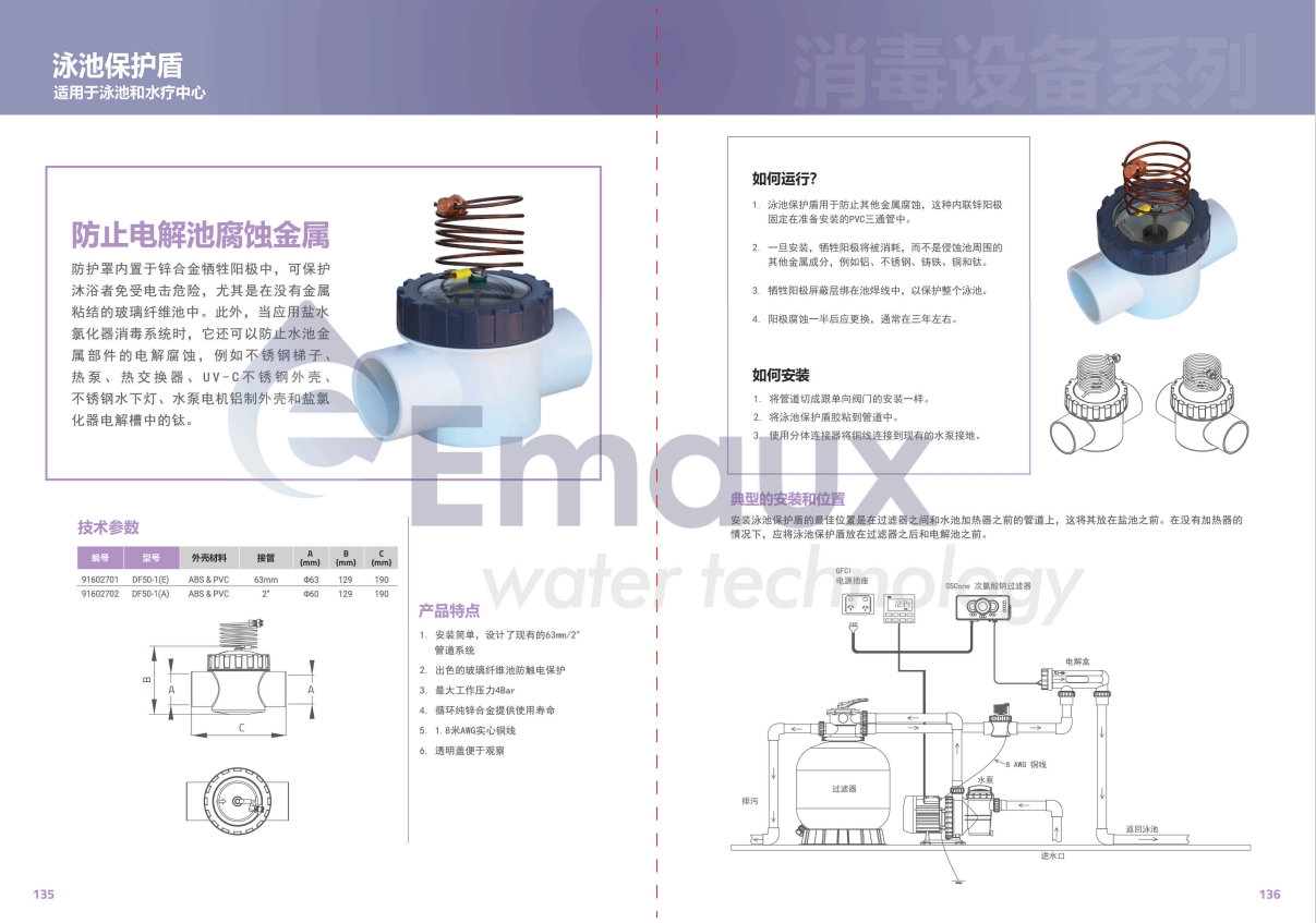 防護罩內(nèi)置于鋅犧牲陽極中,可保護沐浴者免受電擊危險,尤其是在沒有金屬粘結(jié)的玻璃纖維池中。此外,當(dāng)應(yīng)用鹽水氯化器消毒系統(tǒng)時,它還可以防止水池金屬部件的電解腐蝕,例如不銹鋼梯子,熱泵熱交換器, UV-C不銹鋼外殼,不銹鋼水下燈,水泵電機鋁制外殼和鹽氯化器電解槽中的鈦。