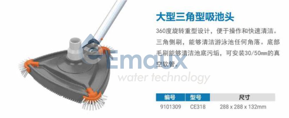 360度旋轉(zhuǎn)重型設(shè)計(jì),便于操作和快速清潔。三角側(cè)刷,能夠清潔游泳池任何角落。底部毛刷能夠清潔池底污垢,可安裝30/50mm的真空軟管。