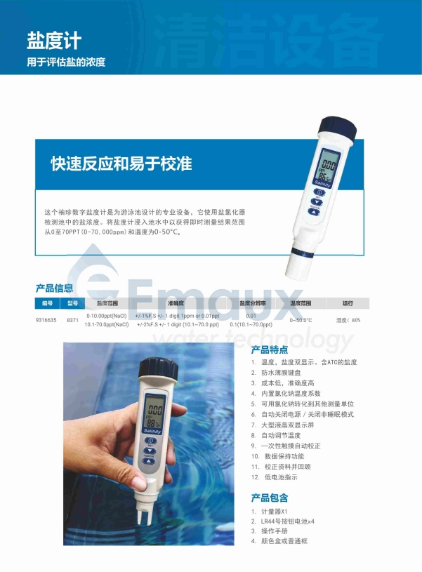 這個袖珍數(shù)字鹽度計是為游泳池設(shè)計的專業(yè)設(shè)備,它使用鹽氯化器檢測池中的鹽濃度。將鹽度計浸入池水中以獲得即時測量結(jié)果范圍從0至70PPT(O-70,000ppm)和溫度為0-50°C。