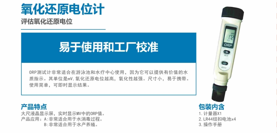 ORP測試計非常適合在游泳池和水療中心使用,因為它可以提供有價值的水質(zhì)指示。其單位是mV,氧化還原電位越高,氧化性越強。尺寸小,易于攜帶。使用簡單,可即時顯示結果。